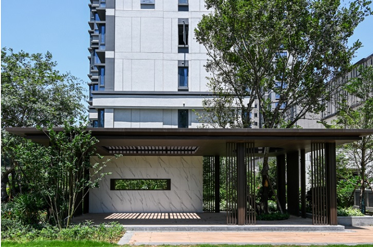 建筑立面設(shè)計上,項目團隊以“現(xiàn)代為形,東方為韻”,橫向線條勾勒現(xiàn)代輪廓,淺色真石漆搭配石材干掛與金屬花窗,頂部抽象化飛檐構(gòu)架呼應(yīng)中式美學(xué),形成 “橫如流水,縱似山巒” 的立體韻律;景觀設(shè)計以“鷺洲尋跡”為主題,將廈門古港文化融入場景,260 米有氧環(huán)跑綠道串聯(lián)核心景觀,讓自然生態(tài)與人文底蘊在社區(qū)中交融共生。