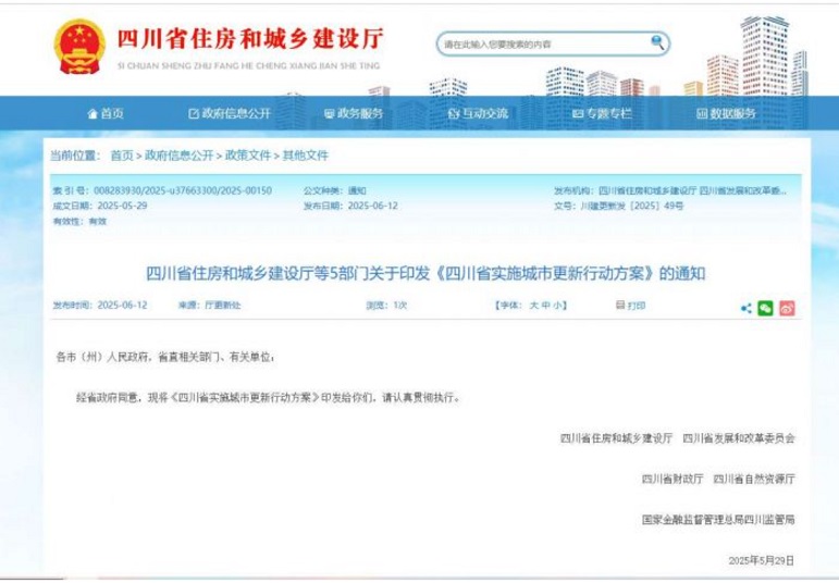 四川經(jīng)濟(jì)網(wǎng)訊(記者 李洋)6月12日,記者從四川省住房和城鄉(xiāng)建設(shè)廳官網(wǎng)獲悉,近日,四川省住房和城鄉(xiāng)建設(shè)廳、四川省發(fā)展改革委、四川省財(cái)政廳、四川省自然資源廳、國家金融監(jiān)督管理總局四川監(jiān)管局聯(lián)合印發(fā)了《四川省實(shí)施城市更新行動方案》(簡稱《行動方案》)!缎袆臃桨浮诽岢,2025年,全省要啟動約600個(gè)城市更新重點(diǎn)片區(qū),實(shí)施約3800個(gè)城市更新項(xiàng)目,持續(xù)改善城市功能品質(zhì),建設(shè)高品質(zhì)宜居空間。