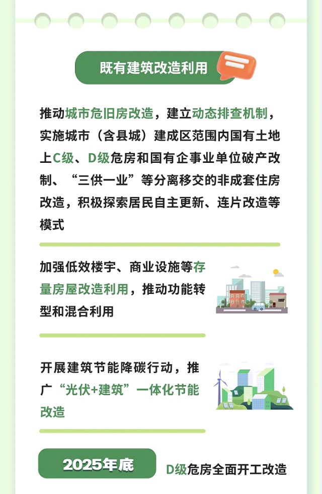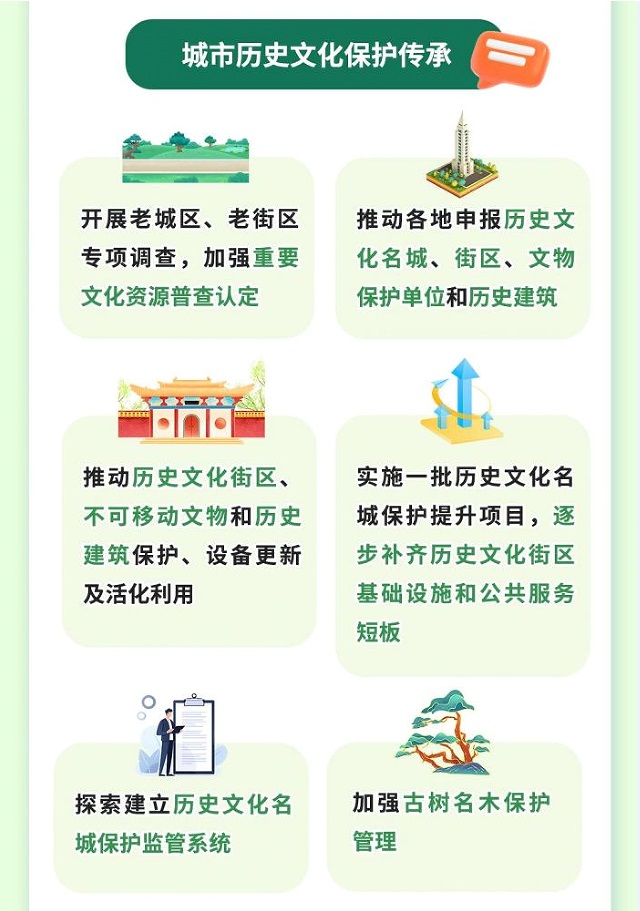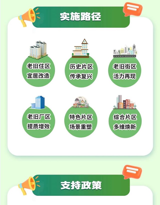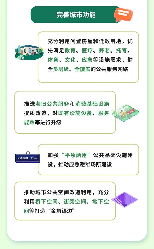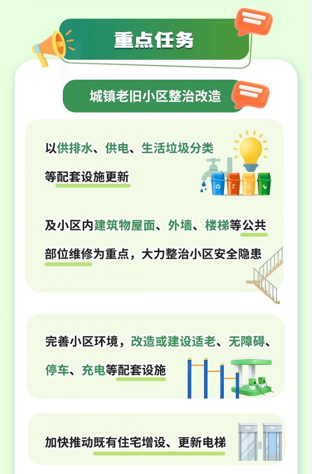 《行動方案》圍繞八大重點(diǎn)任務(wù)展開部署,包括圍繞城鎮(zhèn)老舊小區(qū)整治改造、城中村和老舊街區(qū)廠區(qū)更新改造、既有建筑改造利用、城市基礎(chǔ)設(shè)施更新改造、城市生態(tài)系統(tǒng)修復(fù)、歷史文化保護(hù)傳承、完整社區(qū)建設(shè)、城市功能完善,著力提升城市整體環(huán)境品質(zhì)和綜合承載能力。