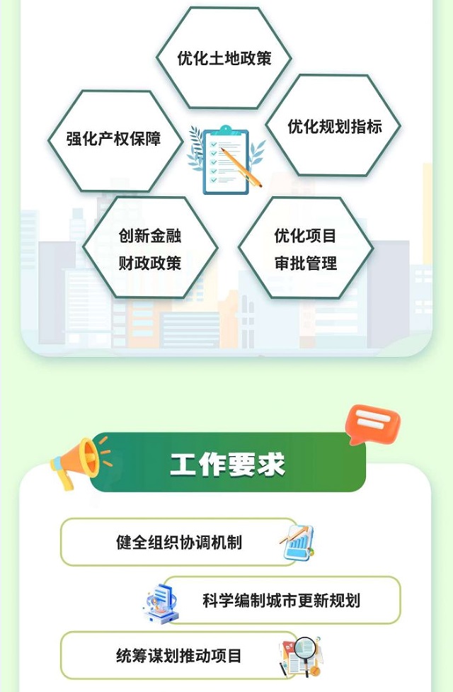 為保障更新行動順利推進(jìn),《行動方案》從優(yōu)化土地政策、強(qiáng)化產(chǎn)權(quán)保障、優(yōu)化規(guī)劃指標(biāo)、創(chuàng)新金融財(cái)政政策、優(yōu)化項(xiàng)目審批管理等五方面,明確了城市更新的具體支持政策,進(jìn)一步釋放土地與空間潛力,激勵(lì)市場多元參與。
