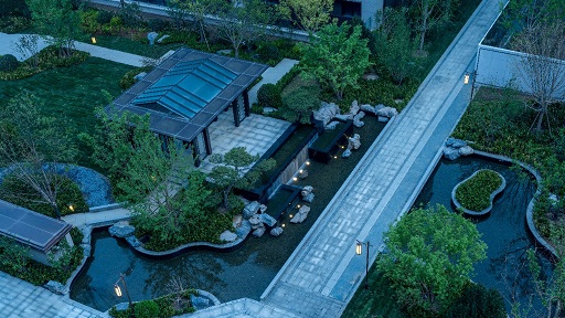 身居于園中,眼光自然而然就會被一座座神顏建筑所吸引。承襲中式居住文化精髓,建筑依嚴(yán)謹(jǐn)規(guī)整的中軸對稱布局,汲取天壇皇乾殿三段式建筑結(jié)構(gòu),故宮太和殿廡殿頂理念,展現(xiàn)出恢宏氣度與文化古韻,成就獨具魅力的新中式建筑。