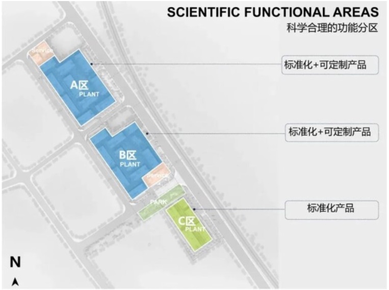 The project features three functional zones: the living supporting area, the standalone factory area, and the flat factory area.