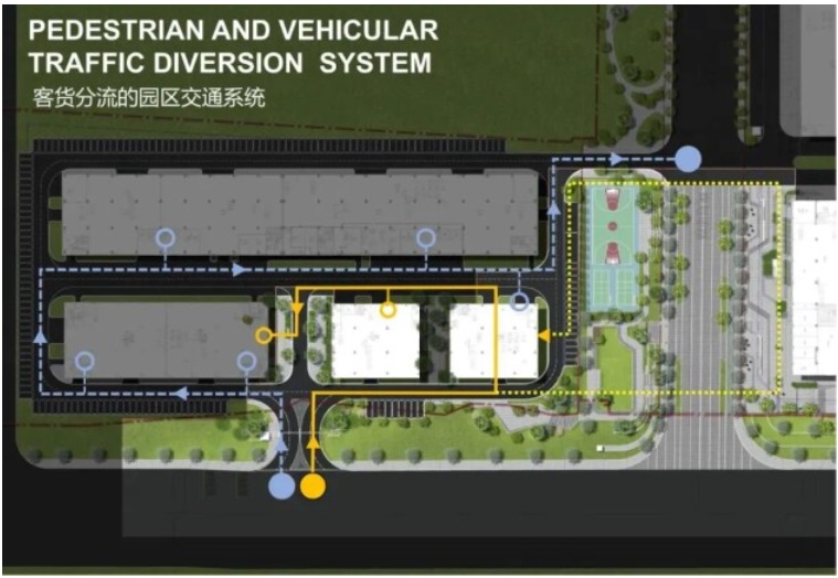 The grid-based traffic system of industrial park ensures efficiency with separated truck entry/exit (east main entrance, secondary exit) and dedicated freight corridors. Pedestrian routes follow landscape axes, while visitor flows begin at the display square, forming a garden-style loop. All circulation systems (freight, pedestrian, visitor) operate independently, creating a congestion-free industrial park network.