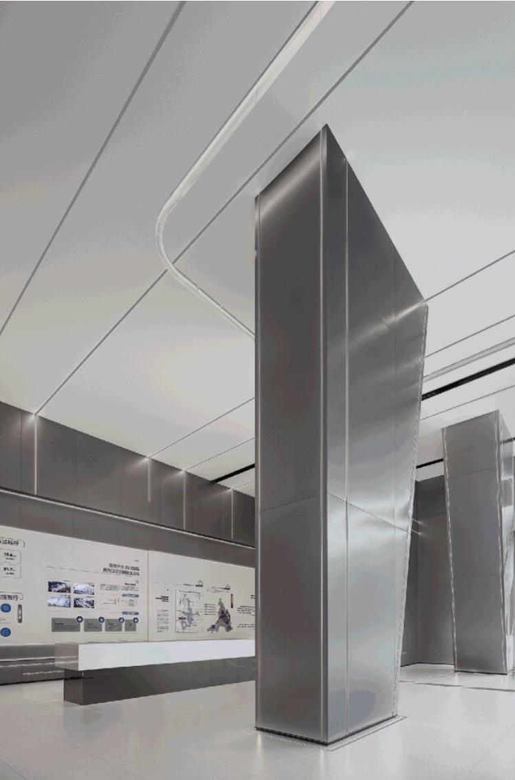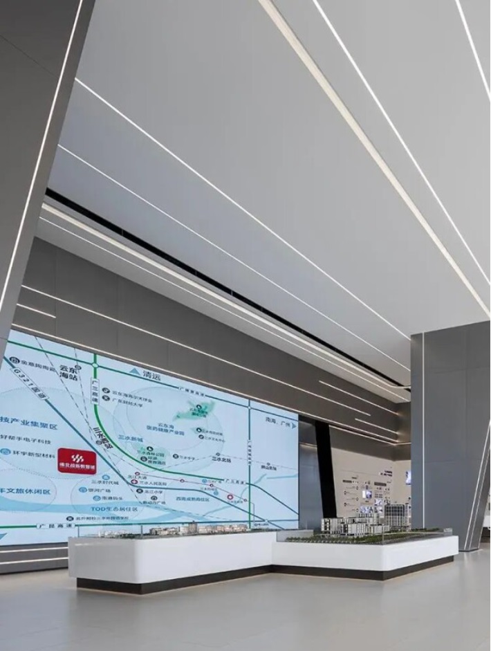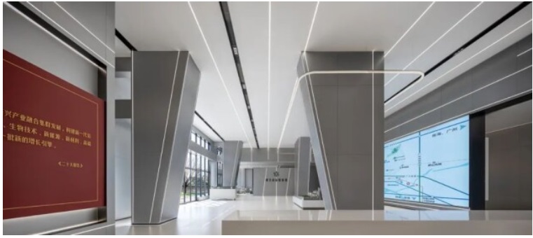 科技為骨:作為“科技營(yíng)造”理念的核心?萍荚卦谡猩讨行牡脑O(shè)計(jì)中無(wú)處不在,金屬鋁板、線性燈光、智能導(dǎo)覽系統(tǒng)和虛擬現(xiàn)實(shí)體驗(yàn)等元素,提升整體科技感與互動(dòng)性,成為了連接參觀者與園區(qū)科技創(chuàng)新成果的橋梁。