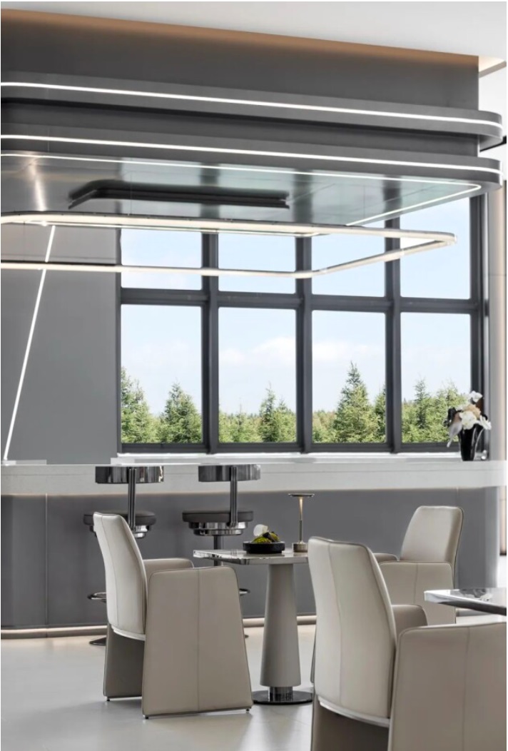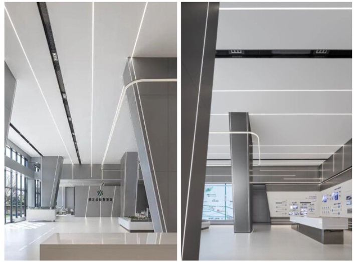 金屬材質(zhì)、鋁板等冷冽的材料成為空間的主調(diào),簡(jiǎn)潔的線條和反射性表面不僅增強(qiáng)了空間的現(xiàn)代感,也為燈光效果提供了完美的載體。線性燈與幾何造型的燈光設(shè)計(jì)交織在空間中,提升了整體科技氛圍的層次感。