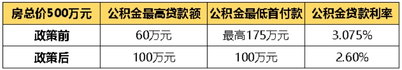 綜合以上,以購買住房總價500萬元為例,公積金貸款100萬元、貸款年限30年為例,由二套房調(diào)整為首套房后,首付款最高減少75萬元,公積金貸款月供最高減少253元。