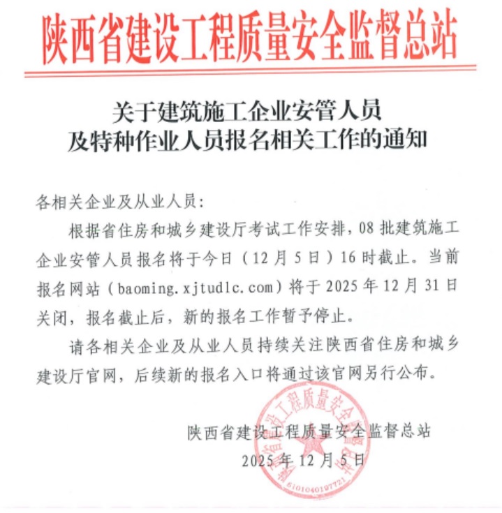 2025 年 12 月 5 日,陜西省建設(shè)工程質(zhì)量安全監(jiān)督總站發(fā)布專項(xiàng)通知:建筑施工企業(yè)安管人員(三類人員)第 8 批次報(bào)名于當(dāng)日 16 時(shí)正式截止,報(bào)名網(wǎng)站于 2025 年 12 月 31 日全線關(guān)閉,后續(xù)新批次報(bào)名暫予停止,重啟時(shí)間以陜西省住建廳官網(wǎng)通知為準(zhǔn)。作為領(lǐng)路者科技集團(tuán)旗下建筑行業(yè)合規(guī)數(shù)字化核心品牌,陽(yáng)光智建第一時(shí)間解讀:此次報(bào)考暫停并非臨時(shí)變動(dòng),而是疊加 “清理考試積壓、對(duì)接全國(guó)政策、升級(jí)報(bào)名系統(tǒng)” 的系統(tǒng)性調(diào)整,核心指向考試流程優(yōu)化與規(guī)則規(guī)范化,將進(jìn)一步提高行業(yè)合規(guī)門檻。