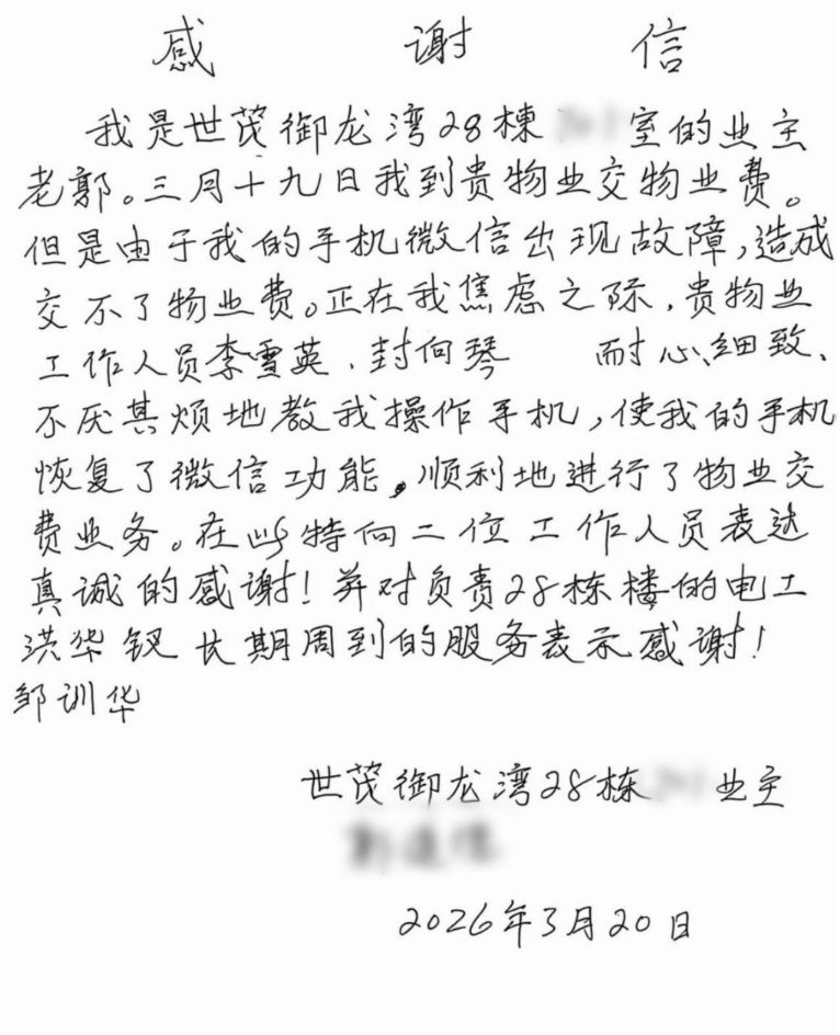 點(diǎn)點(diǎn)滴滴的貼心守護(hù),件件小事的盡責(zé)擔(dān)當(dāng),讓郭先生滿心感動(dòng)。為了感謝世茂服務(wù)物業(yè)服務(wù)人員的盡心服務(wù)和暖心相助,老人特意親筆手寫了一封感謝信,親自送到物業(yè)服務(wù)中心。沒有華麗的辭藻,只有樸實(shí)真摯的話語,一頁信紙承載著老人滿滿的感激,更是對(duì)世茂服務(wù)品質(zhì)最實(shí)在的肯定。