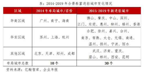 注:2014年合景泰富在鄭州擁有一個項目,但2019年時,在鄭州的項目數(shù)量為0,因此截至2019年12月31日,企業(yè)進駐的城市為39個。