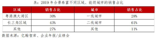 在深耕粵港澳大灣區(qū)和長三角區(qū)域,聚焦一二線城市發(fā)展戰(zhàn)略指引下,合景泰富在相應(yīng)地區(qū)的銷售金額也逐年提升,進而為企業(yè)的營業(yè)收入增長以及盈利能力奠定了基礎(chǔ)。2019年合景泰富在兩大核心城市群的銷售業(yè)績占比合計73%,一二線城市的銷售業(yè)績在總業(yè)績中占89%。