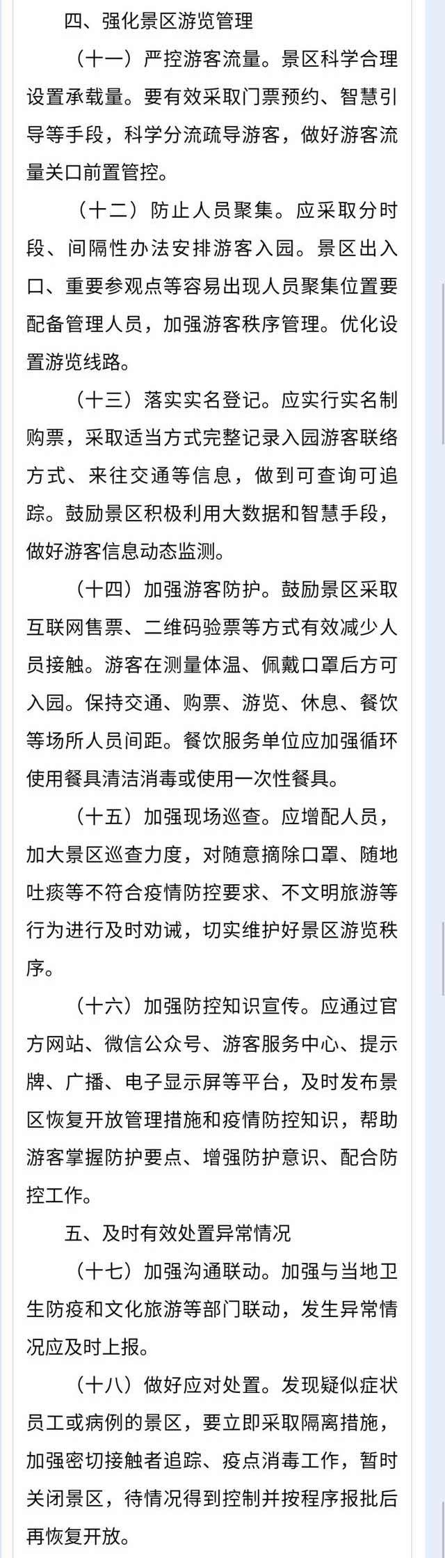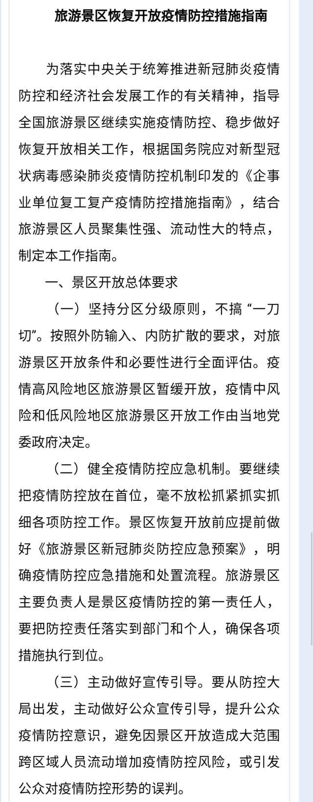 【文旅部緊急發(fā)文:#疫情高風(fēng)險(xiǎn)地區(qū)景區(qū)暫緩開放#】#避免景區(qū)開放引發(fā)公眾誤判#文化和旅游部資源開發(fā)司25日印發(fā)《旅游景區(qū)恢復(fù)開放疫情防控措施指南》,疫情高風(fēng)險(xiǎn)地區(qū)旅游景區(qū)暫緩開放,疫情中風(fēng)險(xiǎn)和低風(fēng)險(xiǎn)地區(qū)旅游景區(qū)開放工作由當(dāng)?shù)攸h委政府決定。避免因景區(qū)開放造成大范圍跨區(qū)域人員流動(dòng)增加疫情防控風(fēng)險(xiǎn),或引發(fā)公眾對(duì)疫情防控形勢(shì)的誤判。應(yīng)實(shí)行實(shí)名制購票,采取適當(dāng)方式完整記錄入園游客聯(lián)絡(luò)方式、來往交通等信息,做到可查詢可追蹤。