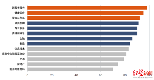 為探究樓內(nèi)不同行業(yè)租戶對地鐵交通的依賴程度,第一太平戴維斯計算出各行業(yè)租戶的地鐵粘性指數(shù)——