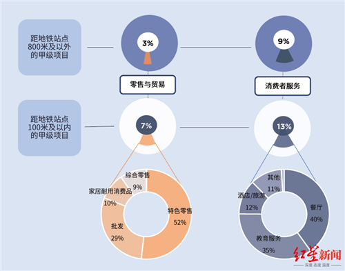 在成都,距離地鐵站點100米內(nèi)的甲級寫字樓里的零售與貿(mào)易和消費者服務(wù)企業(yè),相比離地鐵站點超過800米的情況,辦公面積高4到5個百分點。