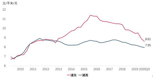 浦東/浦西甲級(jí)寫(xiě)字樓十年租金走勢(shì)(2010年——2020年三季度)