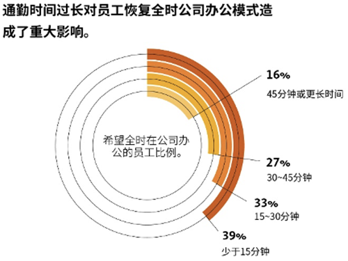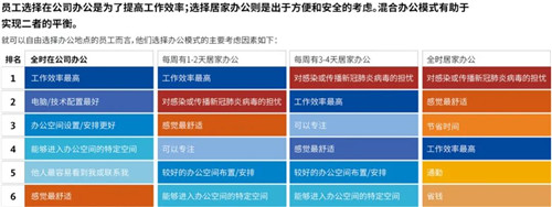 大多數(shù)員工不太能決定自己在哪工作。如果能選擇,他們會更傾向于全時在公司辦公。對許多員工來說,公司辦公比居家辦公更高效,這也是他們愿意全時或大部分時間在公司辦公的原因所在。而對于大部分時間或完全居家辦公的員工,則是出于對新冠肺炎疫情的擔(dān)憂,83%的人希望在疫情限制解除后返回工作崗位。隨著員工陸續(xù)回到公司辦公,許多人要平衡交通通勤、工作生活、健康因素和高效的工作環(huán)境等因素,因此他們往往會選擇混合辦公模式,即居家辦公和在公司辦公相搭配。