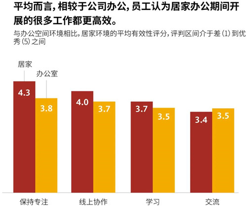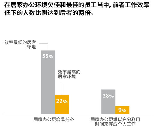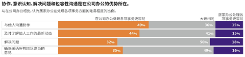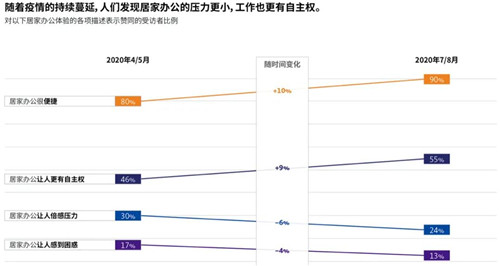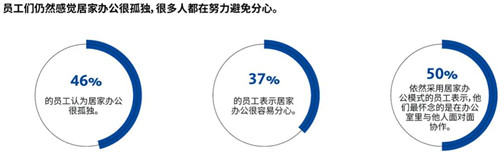 盡管依然有將近一半的員工覺得居家辦公比較孤獨,但相較于疫情爆發(fā)的頭幾周,認為居家辦公方便且能獲得更大授權(quán)的員工比例有所增加。居家辦公幾個月后,很少再有員工感覺這種辦公模式帶來壓力或令人困惑。員工們也意識到居家辦公帶來的實際好處,大多數(shù)人認為居家辦公更容易取得工作和生活之間的平衡,同時還能避免分心。在最近的一次調(diào)查中,認為在家里難以與他人合作以及與同事保持溝通的員工比例有所降低。然而,大多數(shù)員工仍然認為,居家辦公會增加與他人溝通的難度。