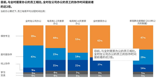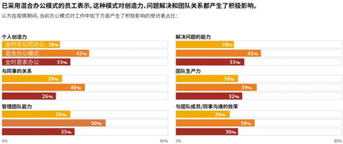 混合辦公模式具有明顯的優(yōu)勢。員工經(jīng)歷過混合辦公模式的體驗后,他們比全時在公司辦公或全時居家辦公的人擁有更好的工作體驗。疫情期間,采用混合辦公模式的員工在個人創(chuàng)造力、工作關(guān)系和工作效率等方面均實現(xiàn)較大提升。在混合模式下,員工通過居家辦公,可以靈活選擇與其日常職責(zé)相匹配的辦公環(huán)境,提高了辦公靈活性;在公司辦公期間又能很直觀的感受到團隊的協(xié)作,可以與同事進行面對面交流,彼此聯(lián)系可能更加緊密,對工作的參與度更高。