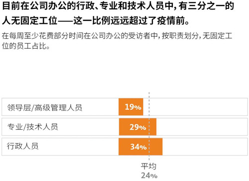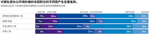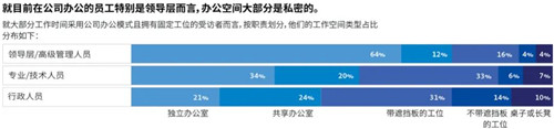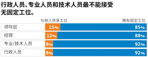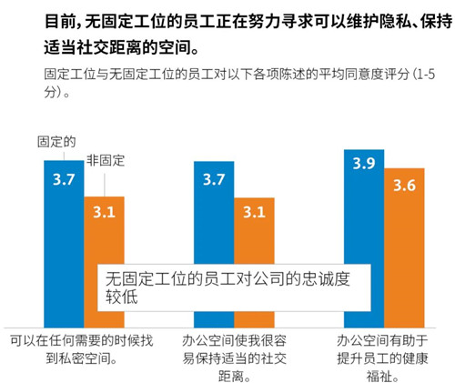 疫情之前,無固定工位的美國員工中有50%希望擁有固定工位。無固定工位主要適用于嚴重依賴面對面協(xié)作開展工作的員工,而非需要長時間集中精力辦公的員工,F(xiàn)在,希望獲得固定工位的員工比以往任何時候都多。此外,大多數(shù)美國員工愿意犧牲居家辦公的靈活性,以換取在公司辦公擁有固定工位。在返回公司辦公的領(lǐng)導(dǎo)層中,獲得自己中意工位的人員占比較高。行政人員和專業(yè)技術(shù)人員沒有固定工位的可能性要高于領(lǐng)導(dǎo)層。目前,人們發(fā)現(xiàn),與固定工位相比,無固定工位不利于保持適當(dāng)?shù)纳缃痪嚯x、隱私保護、健康福祉。