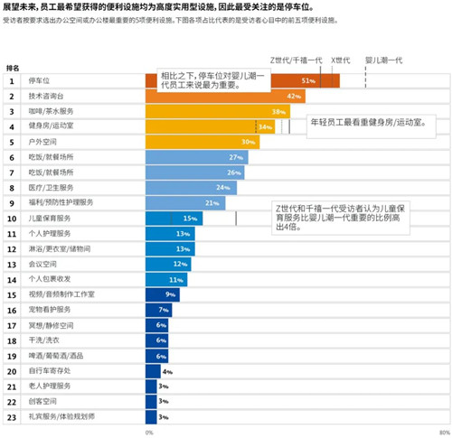 縱觀各世代員工,大部分人期望的是實用型便利設(shè)施,其中停車位穩(wěn)居榜首。