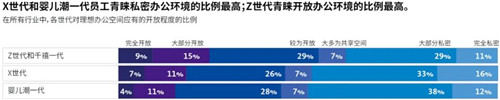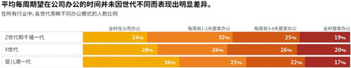 大多數(shù)員工都希望能靈活選擇居家辦公,同時花一些時間進辦公室辦公。雖然希望整個工作日都居家辦公的員工比例相對穩(wěn)定,但希望全時在公司辦公的員工比例因行業(yè)不同而有所差異。消費品行業(yè)的從業(yè)人員、科研人員和政府/國防部門的工作人員更青睞全時在公司辦公。與嬰兒潮一代相比,X世代和千禧一代的員工更青睞混合辦公模式。依據(jù)個人的工作職能對特定辦公空間或面對面協(xié)作的依賴程度,辦公模式的偏好可能有所不同。另外,偏好選擇也可能因家庭或辦公室環(huán)境的效能而有所不同,其中高效的環(huán)境將決定個人更青睞于在哪里辦公。