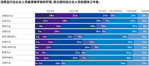 過去幾年里,員工一直要求獲得更多的私密空間。但是,66%的消費品行業(yè)的從業(yè)人員更青睞開放環(huán)境,而73%的法律工作者則希望擁有私密環(huán)境。日常工作的內(nèi)容可能影響到對辦公環(huán)境的選擇,而每個行業(yè)的慣例也是如此。歷史數(shù)據(jù)顯示,法律事務(wù)所更注重私人辦公室,而科技公司則一直在推行更開放的辦公環(huán)境。辦公室是團隊進行偶然互動、建立社交聯(lián)系的場所,也是實現(xiàn)更多協(xié)作活動的聚焦點。相較于老員工,年輕員工可能更看重這些方面,也更青睞開放的辦公環(huán)境。令人驚訝的是,雖然領(lǐng)導(dǎo)層更有可能擁有私人辦公室,但跨職能的員工同樣青睞既私密又開放的環(huán)境。
