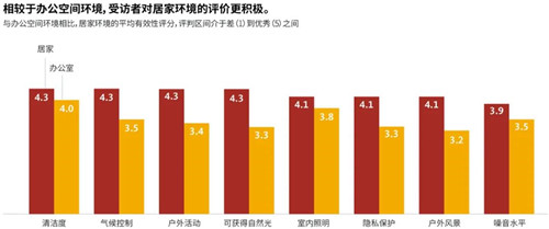 雖然在新冠肺炎疫情爆發(fā)前,許多員工偶爾居家辦公,但只有10%的人會將這種辦公模式固定下來,作為每周正常工作的一部分。在比較居家辦公和公司辦公的環(huán)境時,居家辦公的績效要優(yōu)于其他大多數(shù)辦公模式,尤其是在個人工作績效方面。辦公室仍然被視為開展協(xié)同辦公和建立社會關(guān)系的催化劑;居家辦公并不能輕易取代與同事們面對面的協(xié)作,但我們逐漸發(fā)現(xiàn),居家辦公的體驗也提高了辦公環(huán)境的標準。值得注意的是,住宅的內(nèi)部裝修在戶外空間、隱私性、噪音、氣候控制和可調(diào)節(jié)性等方面均優(yōu)于辦公室。