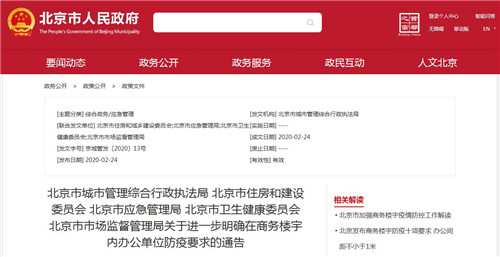北京市城市管理綜合行政執(zhí)法局 北京市住房和建設(shè)委員會(huì) 北京市應(yīng)急管理局 北京市衛(wèi)生健康委員會(huì) 北京市市場(chǎng)監(jiān)督管理局關(guān)于進(jìn)一步明確在商務(wù)樓宇內(nèi)辦公單位防疫要求的通告