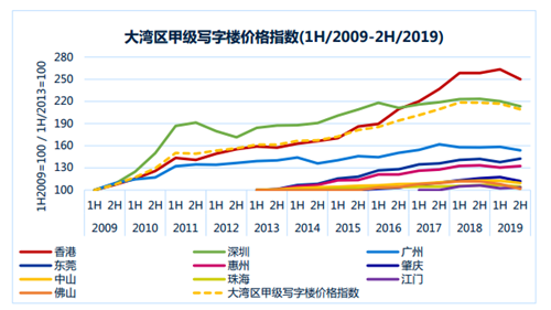 據(jù)第一太平戴維斯華南區(qū)研究部發(fā)布的《大灣區(qū)甲級寫字樓指數(shù)》報告分析顯示,2019年下半年,在經濟不確定因素及供過于求的疊加壓力下,多城租金和價格指數(shù)下跌。