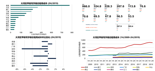 2019年下半年,包括香港、廣州、深圳、珠海在內的八個城市的寫字樓總租用成本均有所下降,而其余三城則呈現(xiàn)增長。