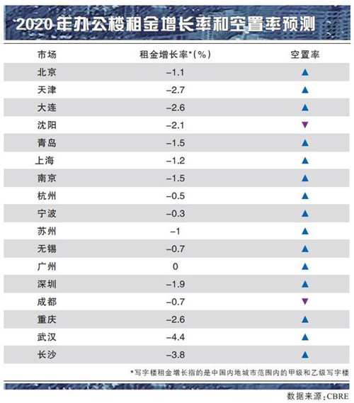 世邦魏理仕認為,若新冠疫情整體能在2-3個月內得到控制,則對寫字樓租金帶來的影響有限。預測一線城市北京、上海和深圳租金下跌的勢頭會有所緩解。二線城市供過于求局面難改,預計2020年租金水平將同比下降1.8%以上。2020年全國寫字樓平均租金預計將同比下降1.5%。
