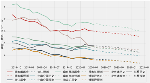 圖:上海8大商圈甲乙級(jí)寫字樓歷史租金及未來(lái)走勢(shì)預(yù)測(cè)(2018年9月~2021年3月)
