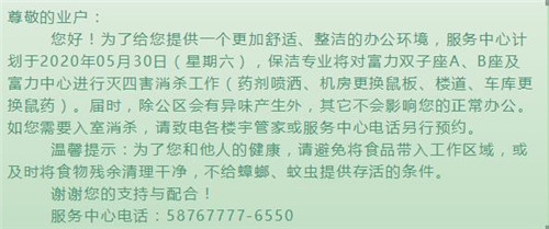 據(jù)北京富力中心官微消息,05月30日,保潔專(zhuān)業(yè)將對(duì)富力雙子座A、B座及富力中心進(jìn)行滅四害消殺工作(藥劑噴灑、機(jī)房更換鼠板、樓道、車(chē)庫(kù)更換鼠藥)。