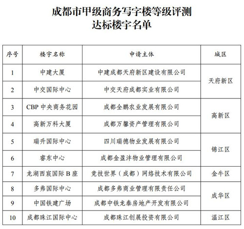 經(jīng)過專家及市樓評委共同審定,全市共10棟商務(wù)寫字樓達到成都市甲級商務(wù)寫字樓認定標準。成都市樓宇等級評定委員會對評審結(jié)果進行公示,公示期為7個工作日。