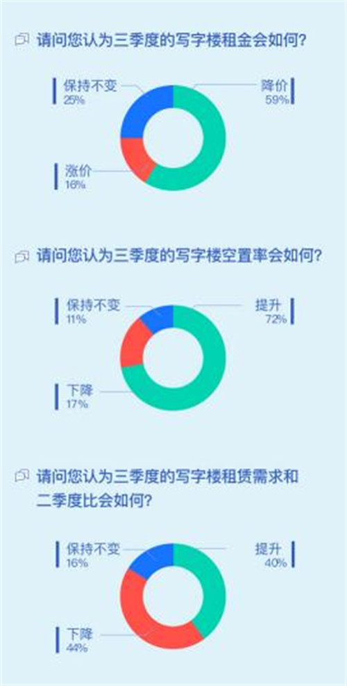 在接受調(diào)研的經(jīng)紀(jì)人中,有59%的經(jīng)紀(jì)人認(rèn)為三季度的寫字樓租金會(huì)下降,72%的經(jīng)紀(jì)人認(rèn)為三季度的寫字樓空置率會(huì)提升。24%的經(jīng)紀(jì)人認(rèn)為到三季度才可恢復(fù)到疫情之前的水平,不過仍有40%的經(jīng)紀(jì)人認(rèn)為三季度寫字樓租賃需求相比二季度會(huì)上漲。