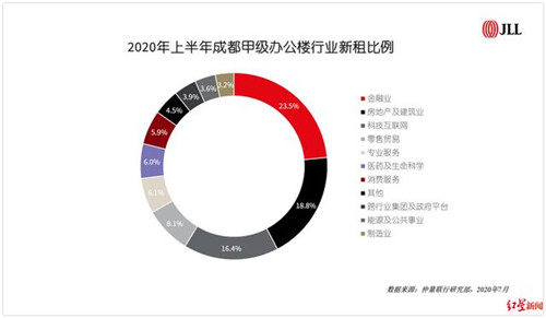 今年上半年,金融業(yè)需求仍居成都首位,其中保險業(yè)尤為突出。金融業(yè)疫后表現(xiàn)相對穩(wěn)健,數(shù)據(jù)顯示,上半年金融業(yè)新租面積近7萬平方米,與2019年下半年基本持平。