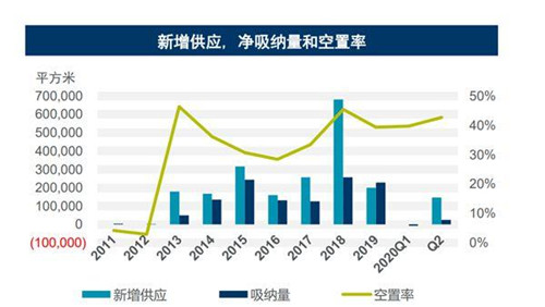 戴德梁行數(shù)據(jù)顯示,2020年上半年,世茂環(huán)球金融中心竣工交付,為長沙甲級寫字樓市場帶來約14.7萬平方米的新增供應(yīng),將長沙市甲級寫字樓市場整體存量推升至213.8萬平方米。新項目的入市疊加疫情的影響共同推動長沙市整體空置率環(huán)比上升2.9個百分點至42.7%。