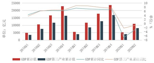 圖:2018年Q1~2020年Q2廣州GDP、第三產(chǎn)業(yè)累計(jì)值及同比