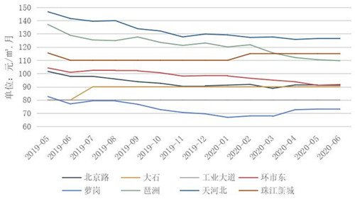 圖:2019年5月~2020年6月深圳重點(diǎn)商圈甲乙級(jí)寫字樓租金走勢