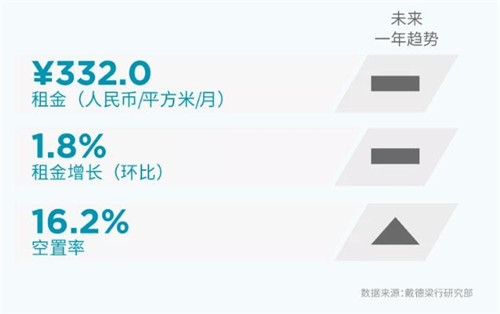 受活躍的市場需求影響,全市空置率環(huán)比下降1.3個(gè)百分點(diǎn)至16.2%。整體市場租金企穩(wěn)回升,在連續(xù)十個(gè)季度持續(xù)下跌后首次迎來小幅上揚(yáng),環(huán)比上升1.8%至每月每平方米人民幣332.0元。
