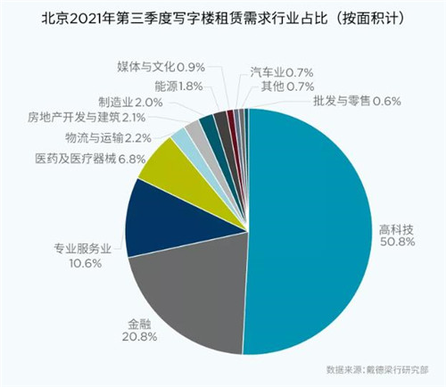 三季度,得益于市場態(tài)勢(shì)活躍和需求強(qiáng)勁,北京全市寫字樓季度凈吸納量高達(dá)24.2萬平方米,為自2018年二季度以來單季最高值。細(xì)分到具體行業(yè)來看,高科技企業(yè)持續(xù)活躍,成交占總成交面積的50.8%,其次為金融業(yè)和專業(yè)服務(wù)業(yè),分別占成交總面積的20.8%和10.6%。