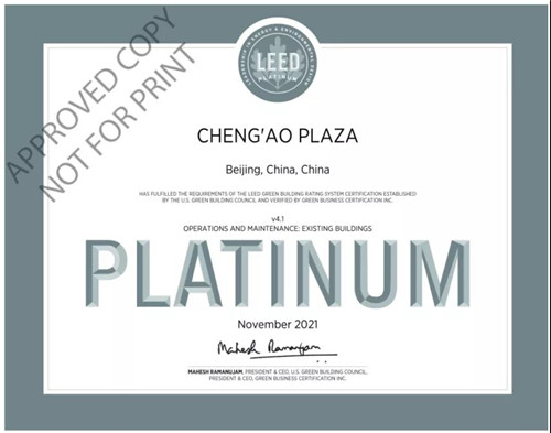 2021年11月,城奧大廈獲得LEED O+M鉑金級認(rèn)證。這是城奧大廈繼榮獲綠建三星認(rèn)證后取得的又一國際性綠色建筑認(rèn)證。
