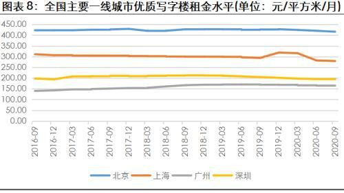 因?qū)懽謽堑牡貐^(qū)聚集效應(yīng)更為顯著,各城市間優(yōu)質(zhì)寫(xiě)字樓租金存在較大差異。國(guó)企、央企總部多位于北京,得益于總部經(jīng)濟(jì)效應(yīng),北京地區(qū)優(yōu)質(zhì)寫(xiě)字樓租金與其它一線(xiàn)城市拉開(kāi)較大距離。2020年9月末,北京優(yōu)質(zhì)寫(xiě)字樓租金為416.10元/平方米/月,高出第二位的上海136.90元/平方米/月;同期末,深圳及廣州寫(xiě)字樓租金分別為194.30元/平方米/月和163.80元/平方米/月,租金價(jià)格分別位列全國(guó)第三和第四位。此外,受益于長(zhǎng)三角一體化背景下南京與杭州都市圈協(xié)調(diào)聯(lián)動(dòng)的強(qiáng)化,南京和杭州優(yōu)質(zhì)寫(xiě)字樓租金較高,2020年9月末分別為119.40元/平方米/月和116.70元/平方米/月,位居二線(xiàn)城市前列,其余二線(xiàn)城市每平方米月租金均不超過(guò)100元。同期末,受新冠疫情影響,全國(guó)主要城市寫(xiě)字樓租金也普遍下降,但相較于零售物業(yè)租金而言,降幅較小。