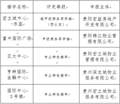 房訊網(wǎng)訊 近日,2021年貴陽(yáng)首批商務(wù)樓宇評(píng)定達(dá)標(biāo)樓宇評(píng)審結(jié)果進(jìn)入公示。此次商務(wù)樓宇等級(jí)評(píng)定中,南明區(qū)共有12棟商務(wù)寫字樓申報(bào)參評(píng)。經(jīng)資格預(yù)審、書面評(píng)審、現(xiàn)場(chǎng)測(cè)評(píng)、暗訪及滿意度調(diào)查等環(huán)節(jié),今年3月13日完成首次評(píng)定工作各項(xiàng)流程,根據(jù)兩項(xiàng)團(tuán)體標(biāo)準(zhǔn),其中5棟商務(wù)樓宇分別達(dá)到相應(yīng)認(rèn)定標(biāo)準(zhǔn)。