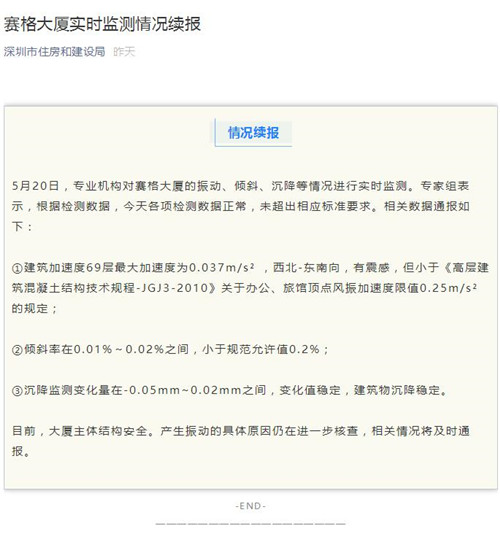 房訊網(wǎng)訊 據(jù)深圳市住建局官微消息,5月20日,專業(yè)機(jī)構(gòu)對賽格大廈的振動(dòng)、傾斜、沉降等情況進(jìn)行實(shí)時(shí)監(jiān)測。專家組表示,根據(jù)檢測數(shù)據(jù),今天各項(xiàng)檢測數(shù)據(jù)正常,未超出相應(yīng)標(biāo)準(zhǔn)要求。