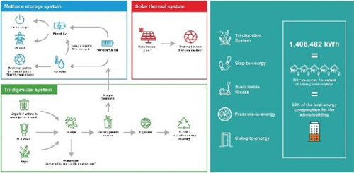 在Living Lab里,使用者行走、推門這些微小運(yùn)動(dòng)所產(chǎn)生的動(dòng)能都將被悉數(shù)搜集,轉(zhuǎn)化為電力供應(yīng)。藻墻使廢水得到二次利用,與廚余垃圾一同制造產(chǎn)生沼氣,用以發(fā)電及提供熱水。