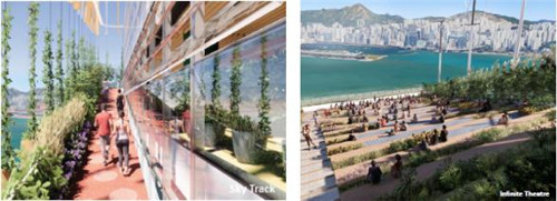 在一條亮眼的綠道之外,奧雅納團(tuán)隊(duì)還為建筑設(shè)計(jì)了種有可食用植物的空中花園,和一個(gè)容納500人的屋頂劇院,可飽覽海濱勝景。“綠色絲帶”上,一公里長(zhǎng)的景觀空中跑道配有動(dòng)能墊等一系列先進(jìn)科技配套設(shè)施。“綠色絲帶”將建筑和整個(gè)太古片區(qū)連為一體,形成一個(gè)新的社區(qū)中心。