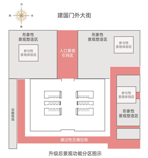 在北京IFC國際財源中心原有外部景觀設計中,臨近長安街,直通大樓北門的大廈北廣場以7米橫寬的北向景觀通道+雙景觀塑造區(qū)「夾道」的空間格局,成就標志性奢闊景觀禮序。但在以車行為主導的長安街沿線,強調威儀的景觀設計卻讓北京IFC北廣場顯得「大氣有余,靈動不足」,難以實現交通工具與城市行人「動靜共融」的平衡。