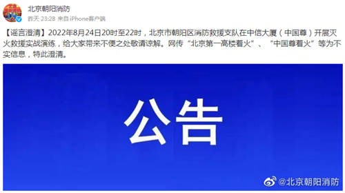 2022年8月24日20時至22時,北京市朝陽區(qū)消防救援支隊在中信大廈(中國尊)開展滅火救援實戰(zhàn)演練,給大家?guī)聿槐阒幘凑堈徑。網傳“北京第一高樓著火”、“中國尊著火”等為不實信息,特此澄清。