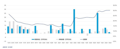 全市空置率環(huán)比上升0.1個(gè)百分點(diǎn),至30.2%,同比上漲6.6%,市場(chǎng)空置壓力較大;由于項(xiàng)目延期,年底的空置率將有所回落,但2025年的預(yù)估空置率將進(jìn)一步上升。