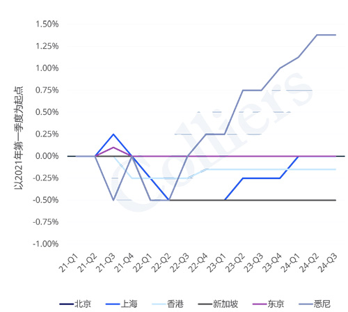 寫字樓市場為第三季度變動最明顯的板塊。美國迎來四年來首次降息,預計有部分亞太地區(qū)市場也會緊隨其后。澳洲利率預計在2024年保持不變。